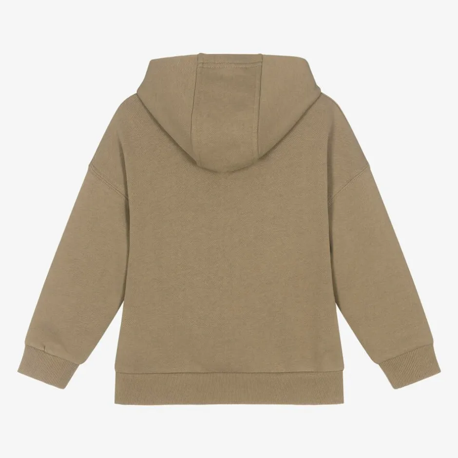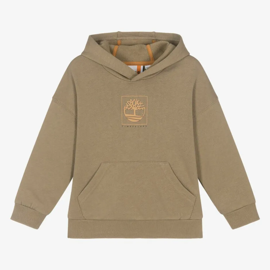 Beige hooded sweatshirt for boys by American brand Timberland, made in mid-weight organic cotton-blend jersey with a soft fleecy feel inside. Casual and comfortable, it has stretchy ribbed trims and a practical pouch pocket. For instant designer appeal, the distinctive tree motif logo print can be seen on the front.