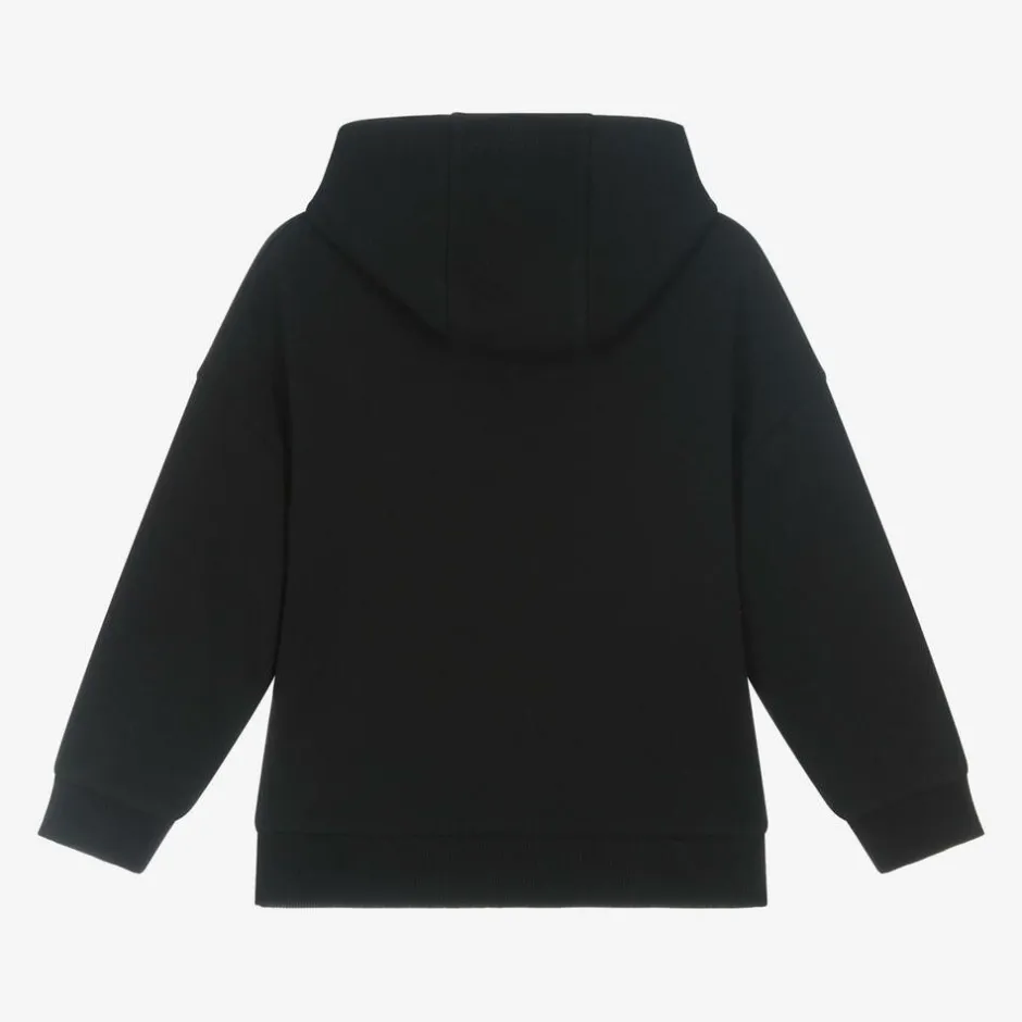 Black hooded sweatshirt for boys by American brand Timberland, made in mid-weight organic cotton-blend jersey with a soft fleecy feel inside. Casual and comfortable, it has stretchy ribbed trims and a practical pouch pocket. For instant designer appeal, the distinctive tree motif logo print can be seen on the front.