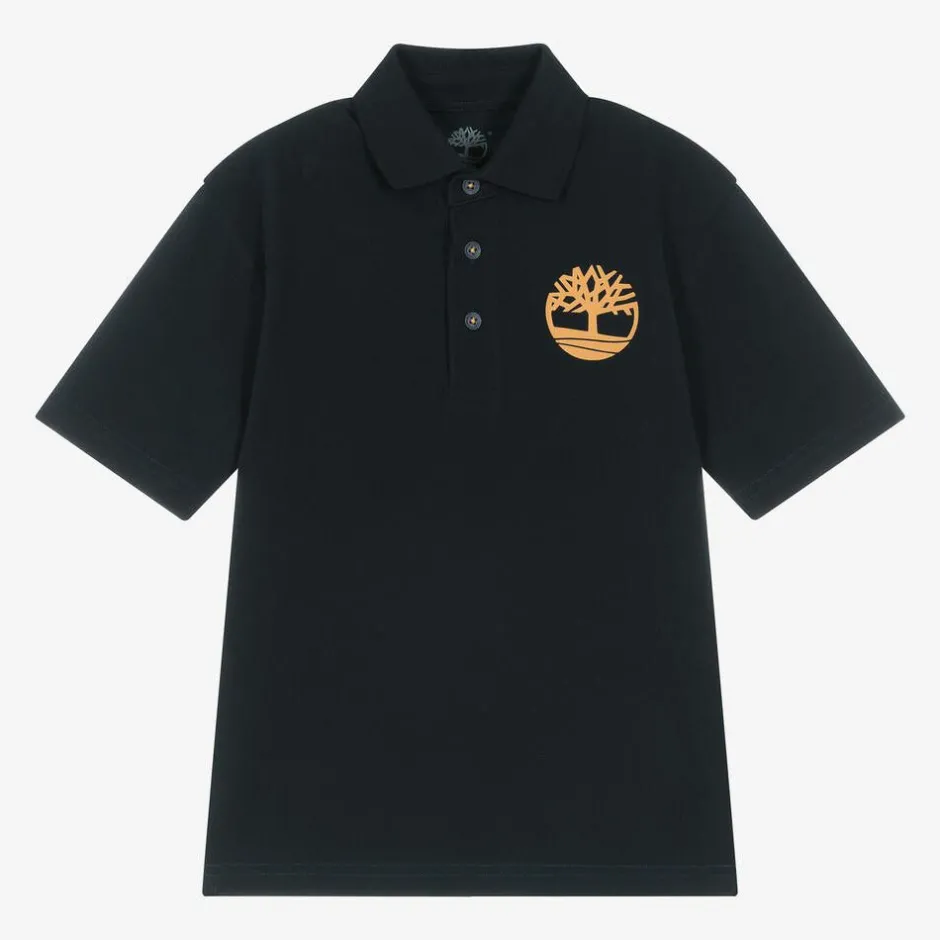 Navy blue short-sleeved polo shirt for boys by American brand Timberland, with the signature tree logo printed on the front in yellow. Made in comfortable, cotton piqué, it has a ribbed collar, branded button fastenings on the placket, and vented side seams.