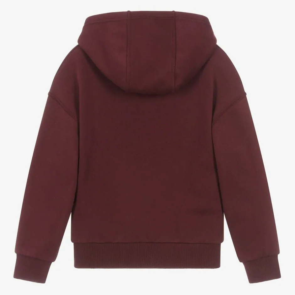 Burgundy red organic cotton hoodie for boys by American brand Timberland. Just right for relaxed days, it is made in comfortable, mid-weight jersey with a warm, fleecy inside and cosy ribbed trims on the long sleeves. Emblazoned across the front is a '1973' appliqué in black and yellow, the year the iconic Timberland boot was introduced, with a logo below. The hoodie has a useful pouch pocket with a logo patch on one side.