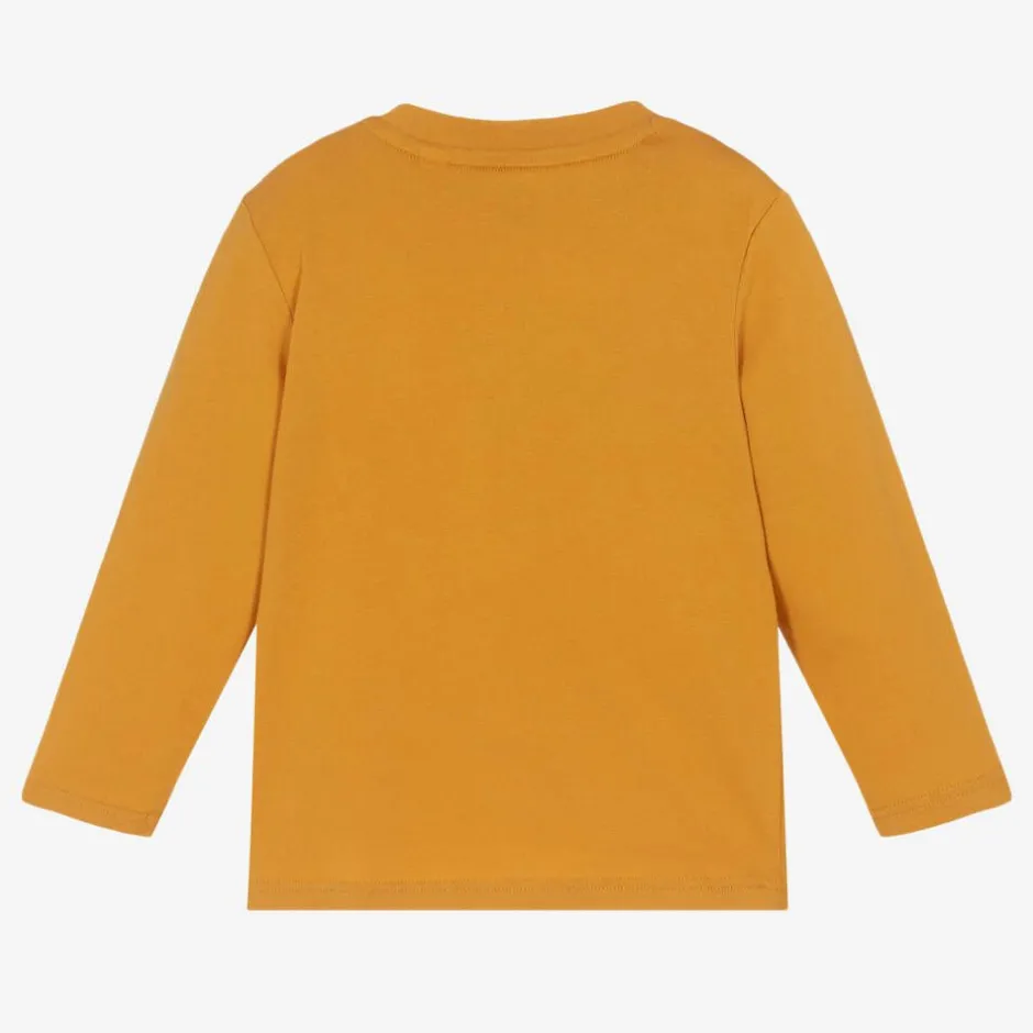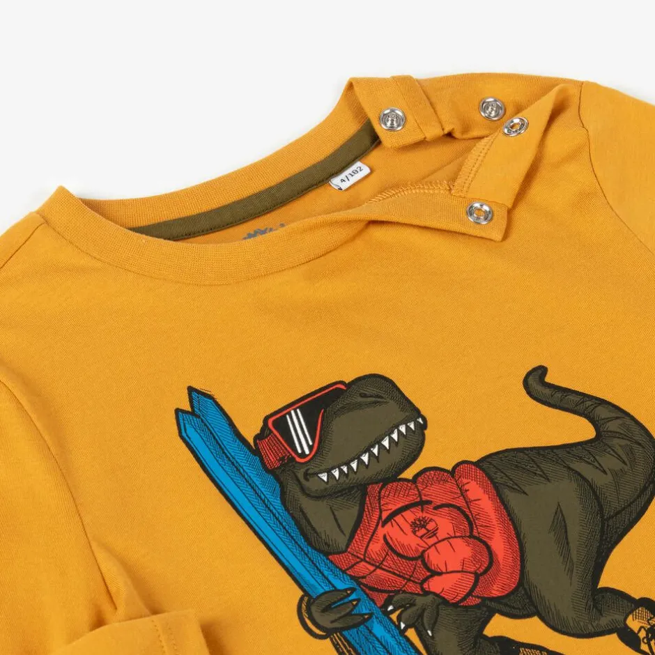 Ochre yellow top for younger boys by Timberland, made in soft organic cotton jersey. There is a cool graphic dinosaur printed on the front, wearing the label's signature boots. It fastens with branded poppers on one shoulder for easy dressing.