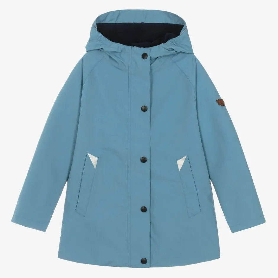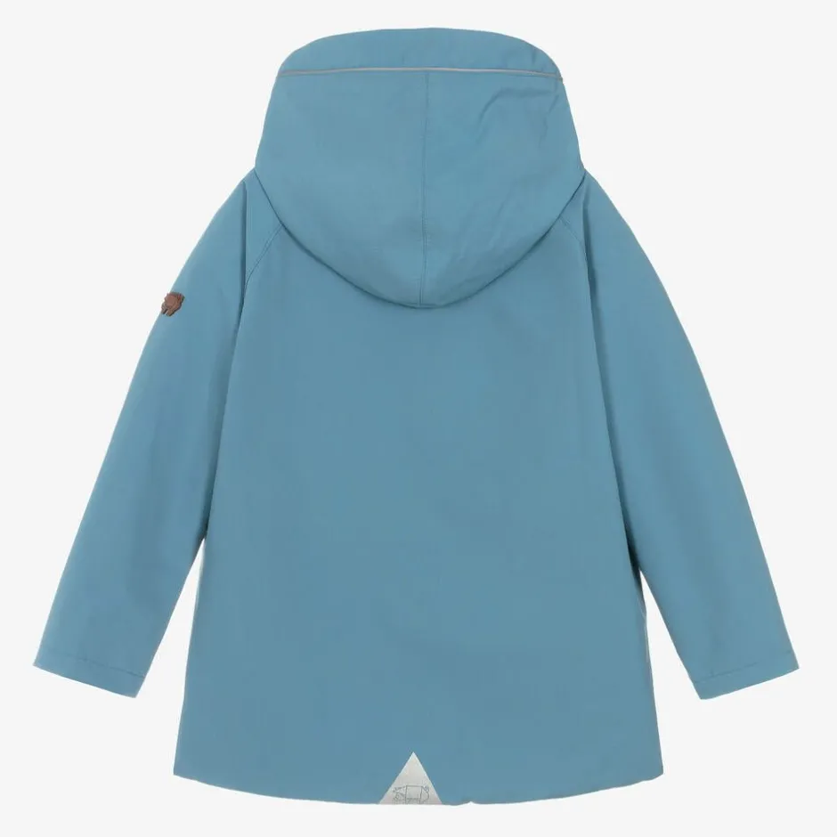 Blue hooded raincoat for boys and girls by British brand Töastie, made in soft recycled polyester from plastic bottles. Waterproof and breathable, it has taped seams and a soft thermal jersey lining. It has fleece lined, popper-fastening hand-warmer pockets, light reflective trims on the front pockets and back hem and micro-fleece soft chin guard for extra wind protection.