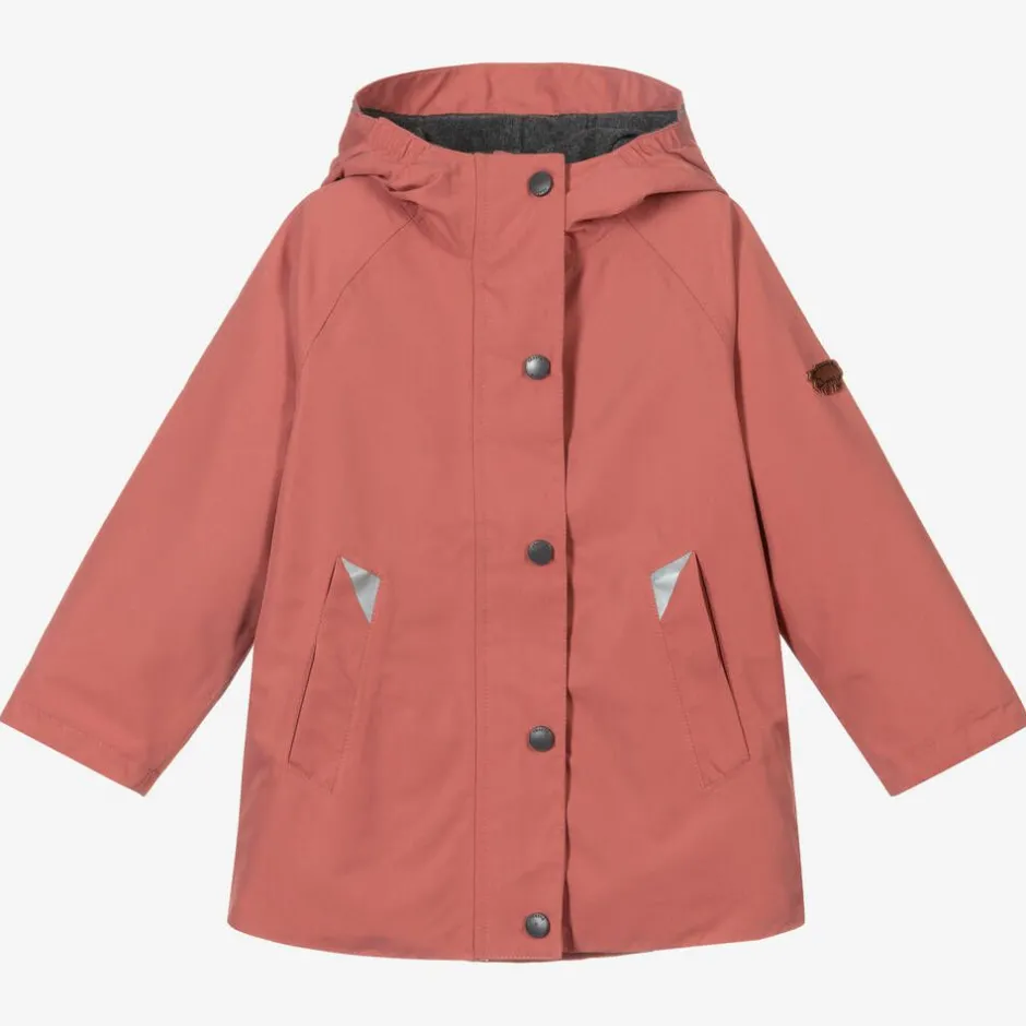 Rose pink hooded raincoat for girls by British brand Töastie, made in soft recycled polyester from plastic bottles. Waterproof and breathable, it has taped seams and a soft thermal jersey lining. It has fleece lined, popper-fastening hand-warmer pockets, light reflective trims on the front pockets and back hem and micro-fleece soft chin guard for extra wind protection.
