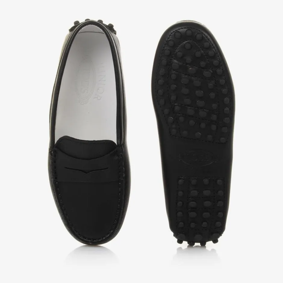 Black Gommino moccasins for boys and girls by luxury Italian brand Tod's. Beautifully handmade in smooth leather, these smart slip on shoes are classically styled with stitched detailing on the toes and a subtle embossed monogram logo on the front. They are lined in smooth leather with leather outer soles detailed with the designer's signature rubberised pebble grips.
