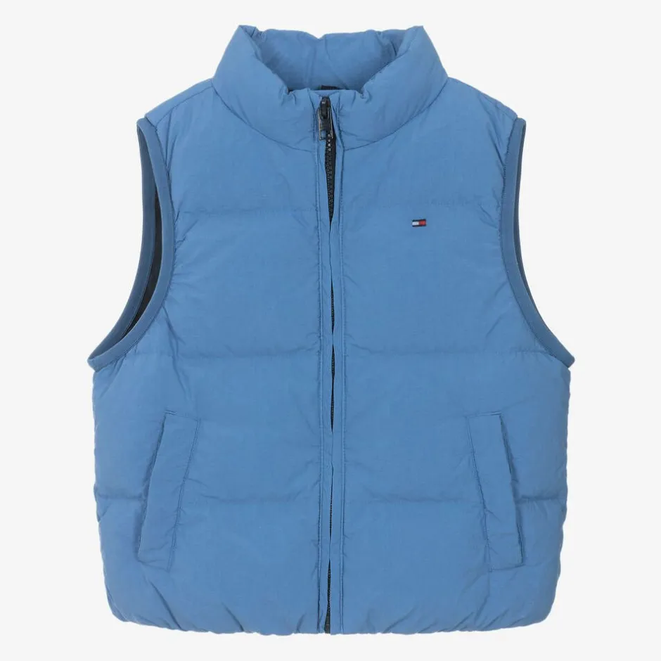 A blue, zip-up gilet for boys and girls by Tommy Hilfiger, padded for warmth in soft down. Great for layering, it has a high neckline, elasticated hem and popper fastening pockets. For a distinctive look, the brand's logo is embroidered on the back in navy blue and a small flag logo can be seen on the chest. The outer material of this product is made from at least 95% recycled materials.