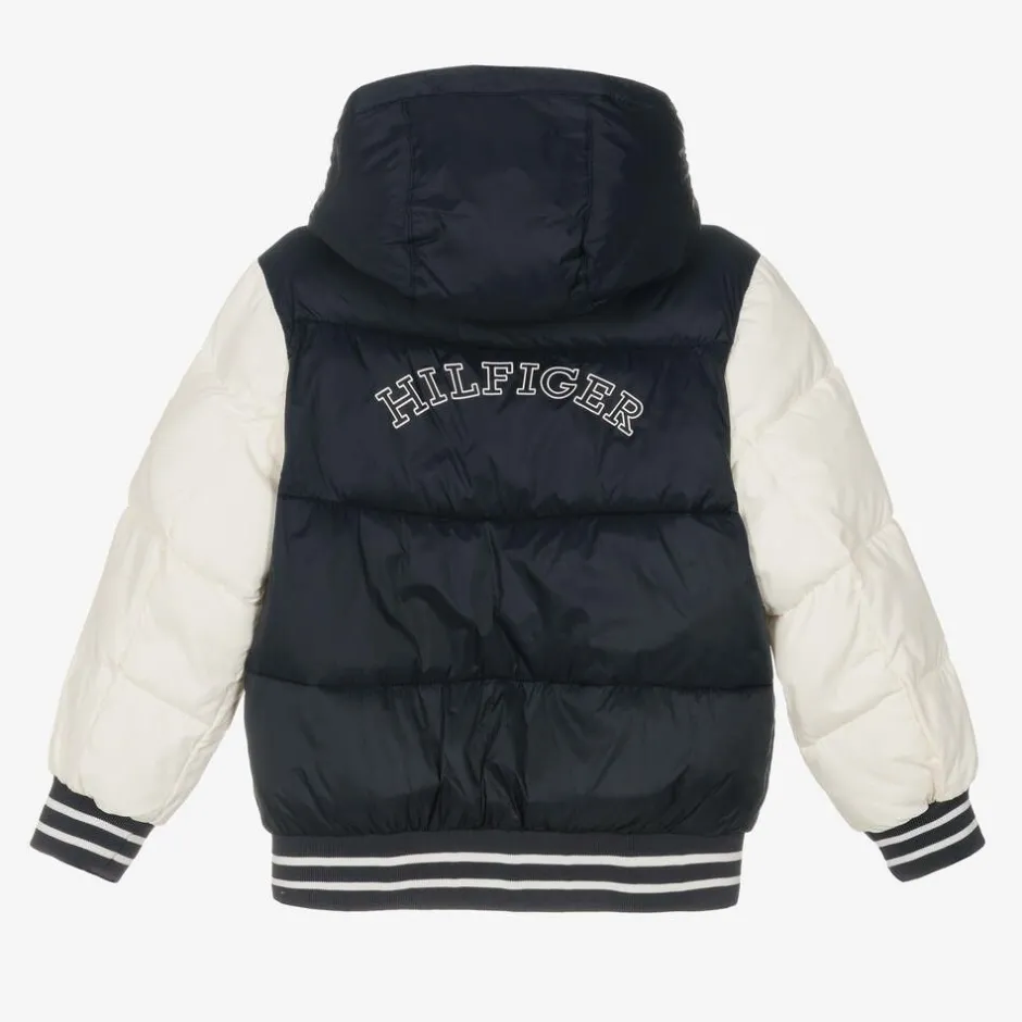 Cosy, padded puffer jacket for boys by Tommy Hilfiger, colourblocked in navy blue and ivory. Soft and silky, it has a hood and fleece-lined pockets for extra cosiness as well as a silky lining for comfort. The jacket has signature flag logo detailing and a varsity-style logo emblazoned across the back. The filling of this product is made with at least 95% recycled polyester.