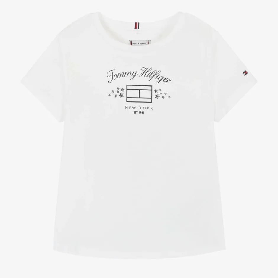 White T-shirt for girls by Tommy Hilfiger, made in soft and stretchy cotton-blend jersey. This casual and comfortable wardrobe staple has a stylish curved hem and features a shiny blue rubberised logo and stars on the front, with an embroidered flag logo on one sleeve for a signature finish.