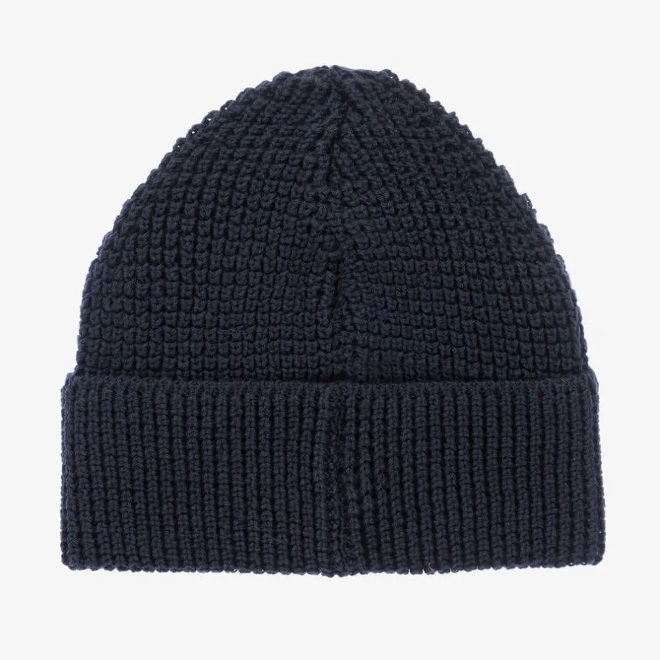 Navy blue knitted beanie hat for girls and boys by Tommy Hilfiger. The designer's big flag logo is stitched across the brim at the front. Made in an organic cotton and acrylic blend, this cosy hat will keep out the cold and wind.