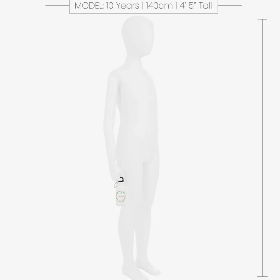 White 400ml water bottle for girls by Treat Republic. Made in strong aluminium, this school-essential is printed with a sweet butterfly garden and your child's name for a personalised touch. It comes with two different types of lids. One has a useful sports cap, and the other has a screw-top lid with a clip and keyring to attach to their backpacks.