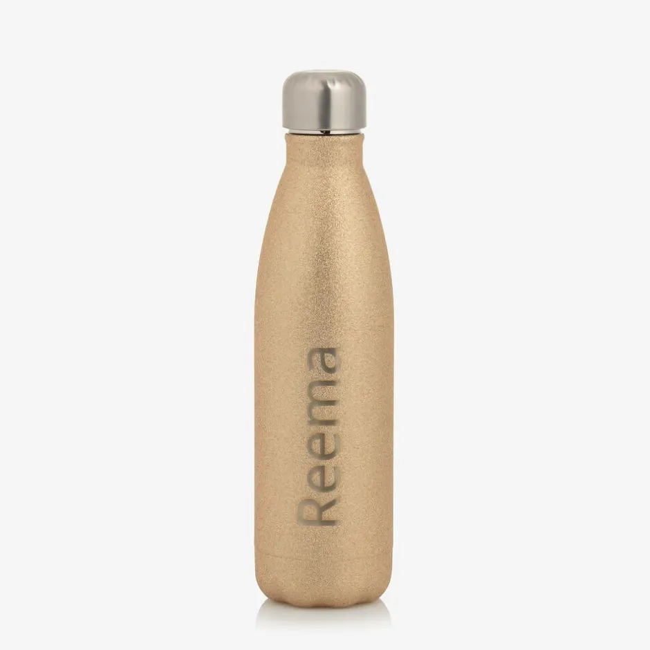 Glittery gold water bottle for girls by Treat Republic. Made in strong, insulating aluminium, this school-essential can be personalised with your child's name and is great for keeping drinks cooler for longer. The screw-top lid easily fastens on the top.