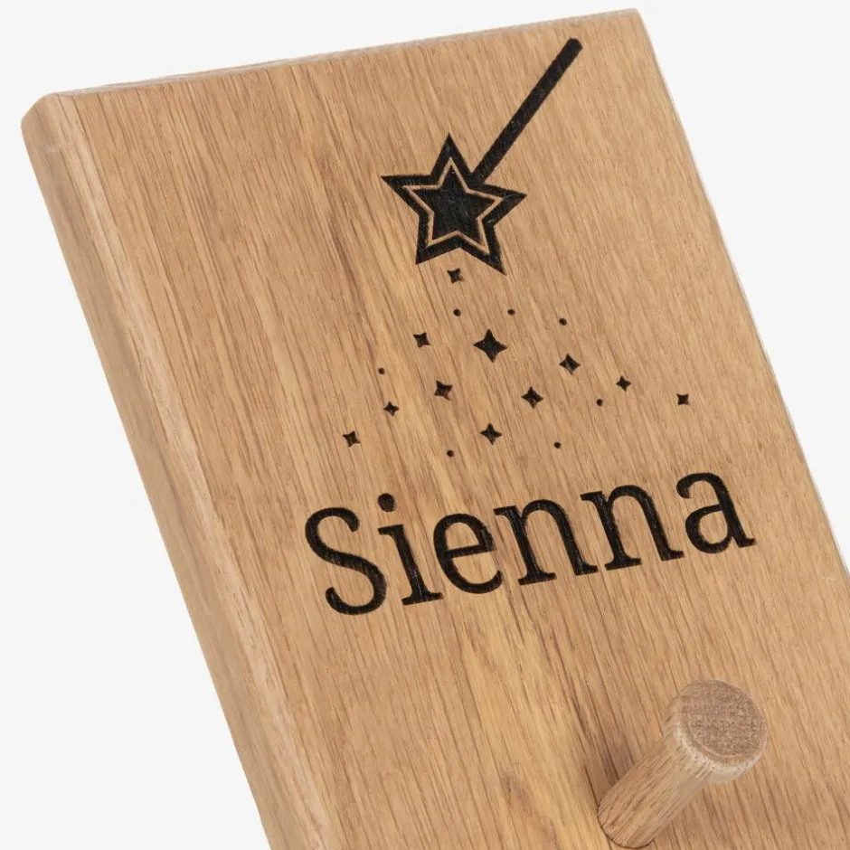 A wooden peg hook for girls from Treat Republic, handcrafted with a magical wand and fairy dust design. A lovely addition to your child's room, this solid oak hook can be engraved with your little one's name adding that personal touch. Easy to hang, there are two keyhole openings on the back.
