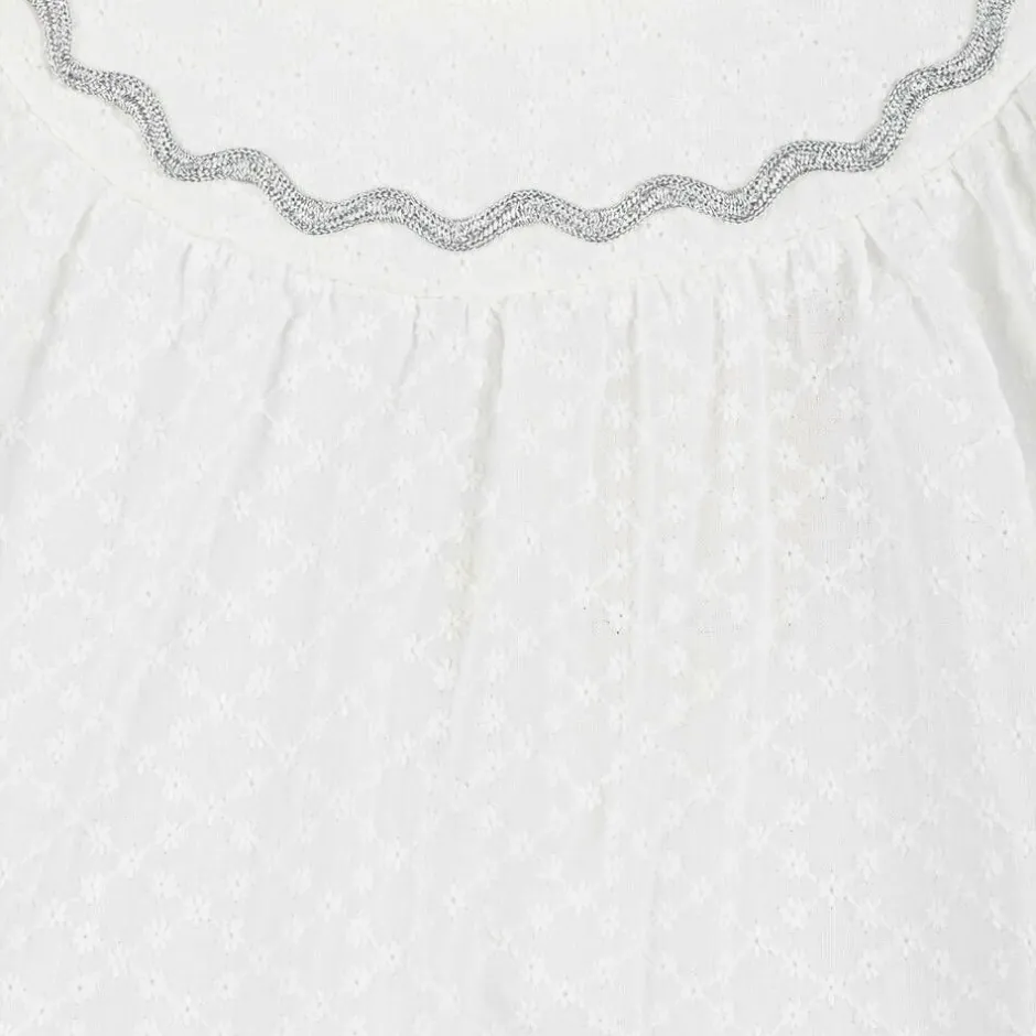 A lovely pink and white skirt set for girls by Tutto Piccolo. The cotton blouse has a pretty embroidered flower pattern, with gently puffed sleeves and sparkly silver ric rac trim around the neckline. It fastens with buttons on the back. Woven with a sparkly silver thread, the cotton-lined skirt has a soft tulle overlay and a comfortable elasticated waist. A pair of stretchy dark grey tights completes the outfit.