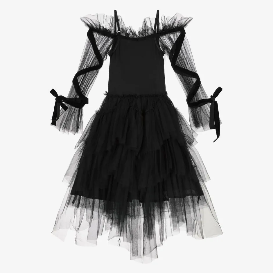 For a stylish, spooky look, this Halloween-inspired black dress for girls is by Tutu du Monde. The fitted jersey bodice features a hand-embellished bow detail and slim adjustable straps. It has an off-shoulder silhouette, with fluted tulle sleeves and velvet ribbons that stylishly lace the arm. The voluminous tutu skirt is made from tiers of gathered tulle which cascade in a zigzag shape for dramatic effect. A soft and lightweight cotton lining adds a comfortable feel. Items are made to last and become more lovely with wear as slight fading and fraying edges add to their charm.