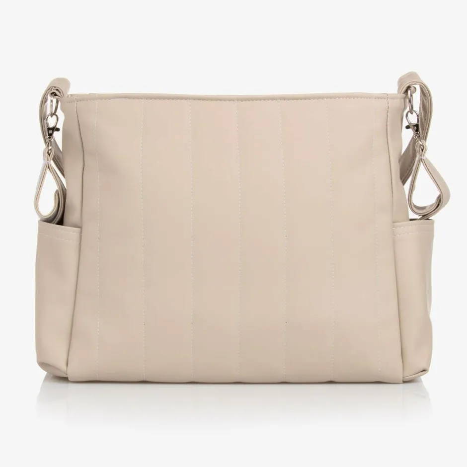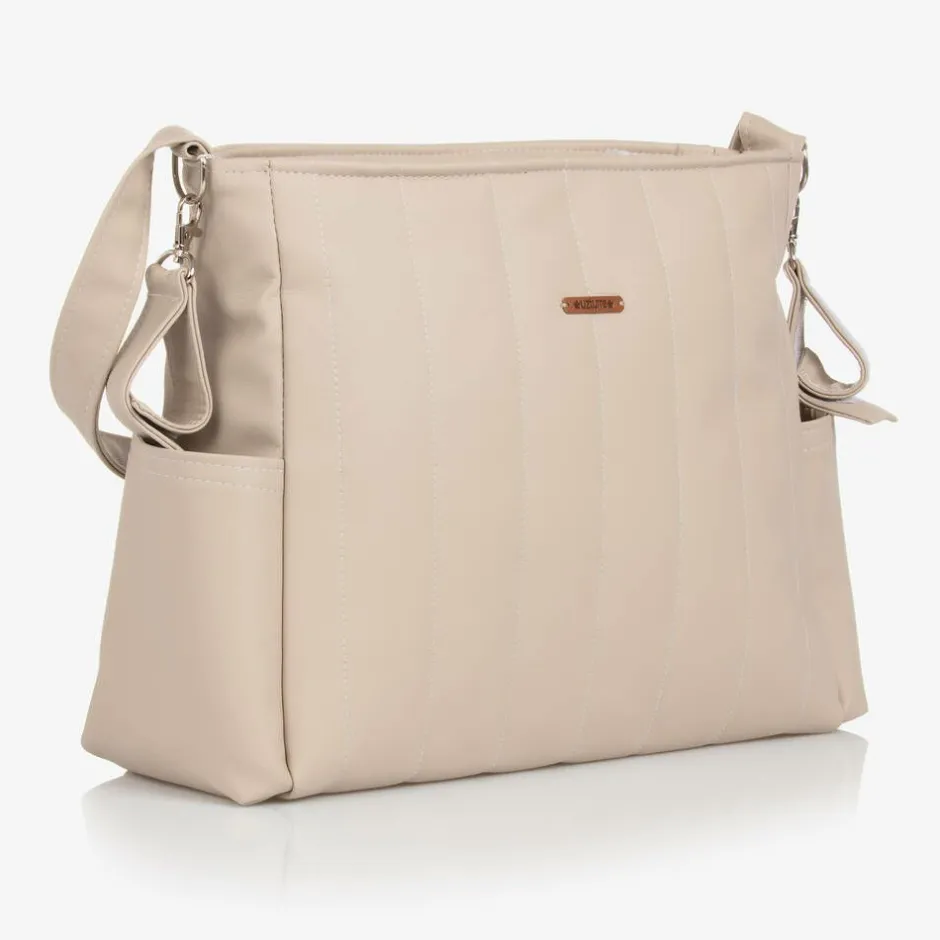 Stylish beige faux leather baby changing bag by Uzturre, fastening with a secure zip. The front is decorated by a brown faux leather logo badge and it has subtle stitching for a quilted effect. The spacious main compartment has internal pouches and elasticated trims, helping to organise belongings. There are pouches pockets on each side for baby bottles and other small essentials. It has a useful fixed shoulder strap and small stroller straps on each side, fastening with velcro. It comes with a towelling changing mat for changing your little one on-the-go.