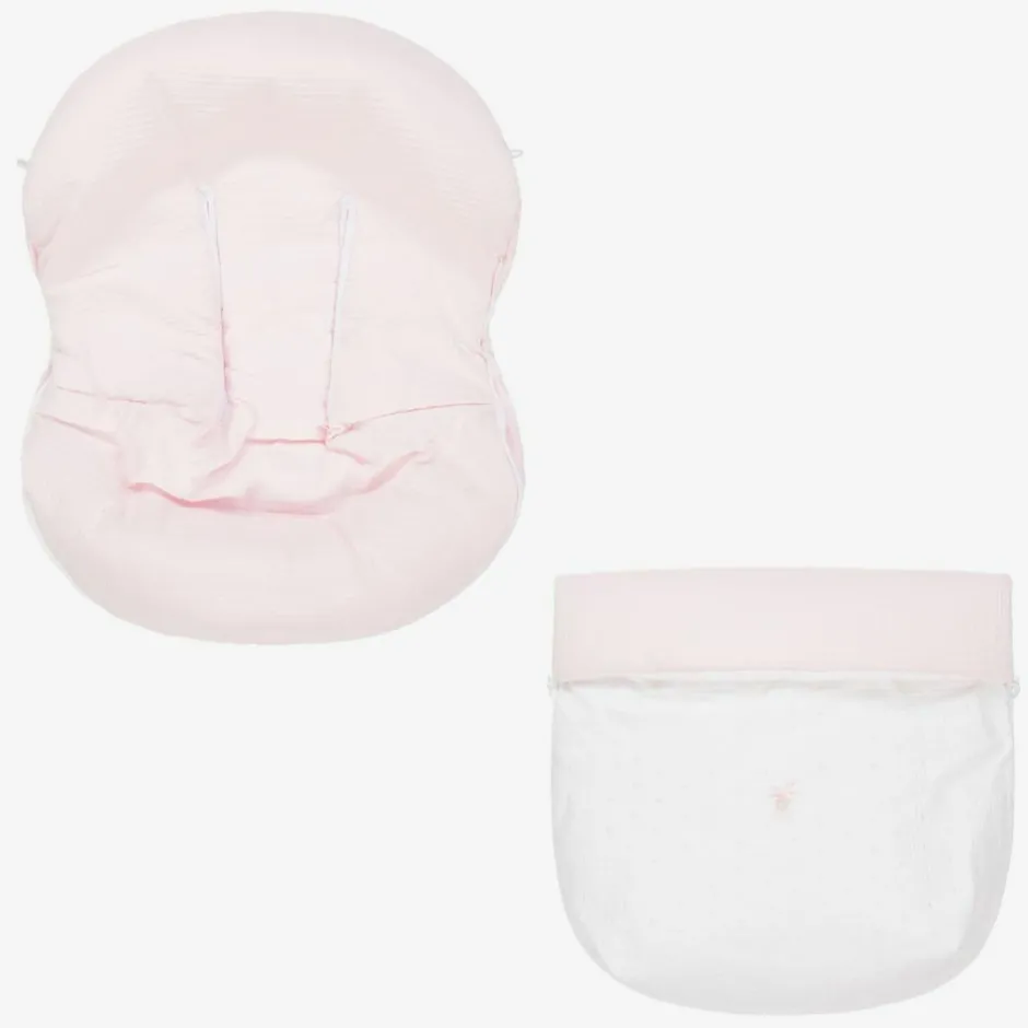 Pink and white cotton baby nest by Uzturre, for use in baby car seats. Made in softly padded organic cotton, it has a pretty scalloped trim and grosgrain ribbon ties. There are zip fastenings on both sides for easy access with elasticated cotton backing to hook over the car seat and velcro fastening holes for shoulder straps.