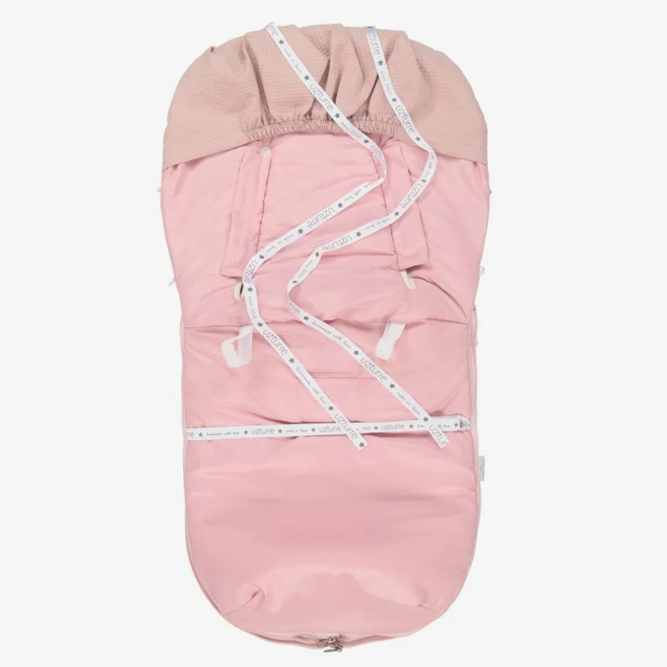Baby girls pretty pink and ivory padded footmuff by Spanish brand Uzturre. Handmade in organic cotton, the front has a pretty pink floral print with a weave textured pink lining and a detachable and reversible scalloped flap detail. There are zips on both sides for easy access, secured with toggles. Hooks over the top of the stroller, it has cut-out openings for stroller straps with velcro and elastic straps on the back to keep it in place.