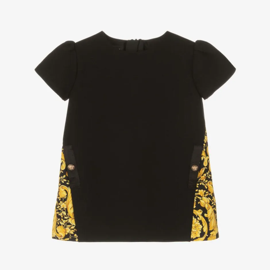 A black shift dress for baby girls by luxury brand Versace, made in mid-weight Milano jersey. For a smart occasion, this designer piece features contrasting silk-blend panels in their signature gold Barocco print. There are decorative Medusa buttons on the front and a neat zip fastening on the back. This Italian-made dress is fully lined with cotton fabric for added comfort.