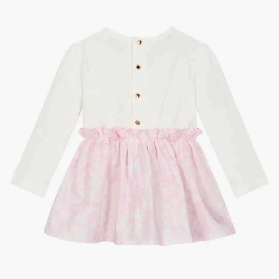 Lovely for baby girls, this pink and off-white cotton dress is by luxury Italian fashion house Versace. The long-sleeved jersey bodice is printed with the designer's iconic Medusa motif and logo on the front. The gathered poplin skirt has a pretty ruffle trim around the elasticated waist, and is patterned in the brand's signature Barocco print in pink and white. The dress fastens with gold-tone branded poppers on the back and comes with matching knickers to complete the look.