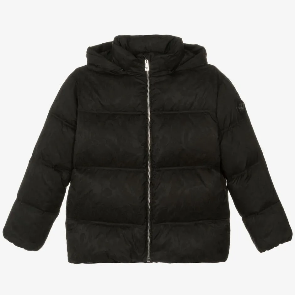 A stylish black puffer coat for boys and girls by luxury Italian label Versace. It is made in a beautifully smooth jacquard, patterned with the iconic, tonal Barocco design and has a Medusa logo patch on one sleeve for a distinctive designer touch. Satin-lined, this mid-weight coat is warmly padded with down and has a hood that detaches with a zip for alternative styling. The exposed silver zip fastening has a branded pull and convenient pockets are hidden in the side seams.
