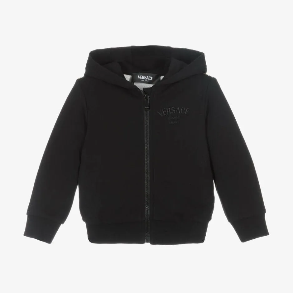 Inspired by the adult collection, this black zip-up hooded top for younger boys and girls by luxury Italian label Versace, is made in soft and comfortable cotton jersey. Making an instant designer statement, the back of the top features the brand's Wild Barocco print in gold and brown, whilst the front has tonal logo embroidery for a more discreet touch. There are useful pockets concealed in the side seams and a branded zip fastening on the front, with a chin guard at the top to protect delicate skin.