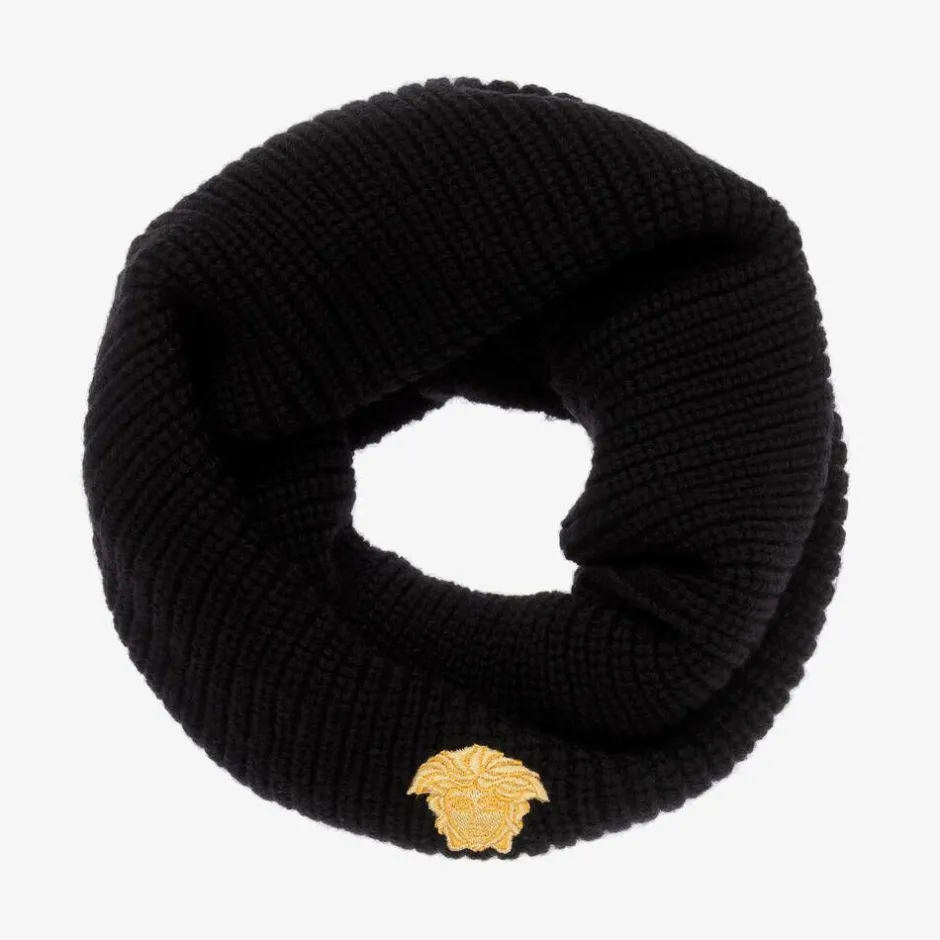 A black knitted snood for boys and girls by luxury Italian brand Versace. Made in Italy, this virgin wool accessory is embroidered with a gold Medusa motif for a signature look. It comes in a branded box, making a lovely gift for someone special.
