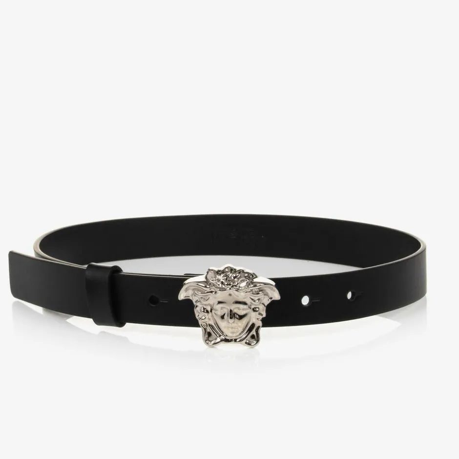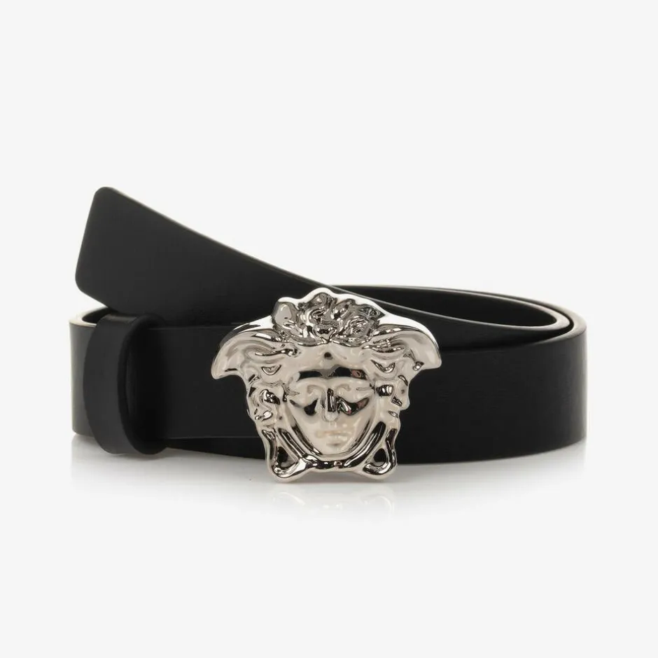 Luxury black belt for boys and girls by Italian designer Versace, made in soft smooth leather. This stylish accessory has a shiny silver metal buckle fastening, shaped in the brand's iconic Medusa logo for an unmistakable designer look.