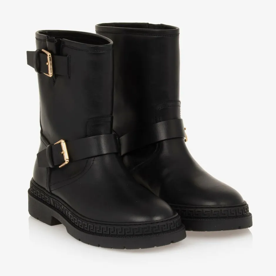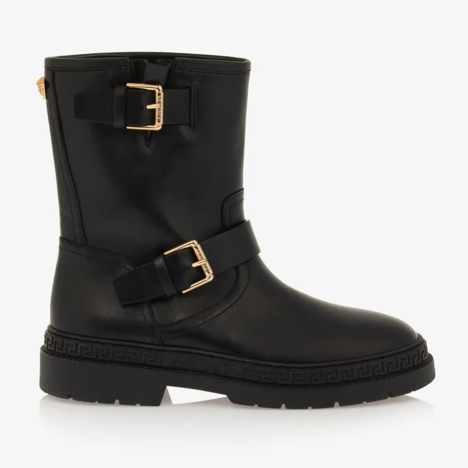A cool and edgy style from Italian designer Versace, these black leather biker boots for boys and girls are trimmed with gold-hued, branded buckles. Medusa, the luxury brand's icon, is featured on the back and embossed Greca trims the midsole for that unmistakable designer look. The lining and insoles are leather for luxurious comfort and the non-slip outsoles are treaded with the House's well-known codes. The upper buckle can be unfastened to help slip the shoes on.