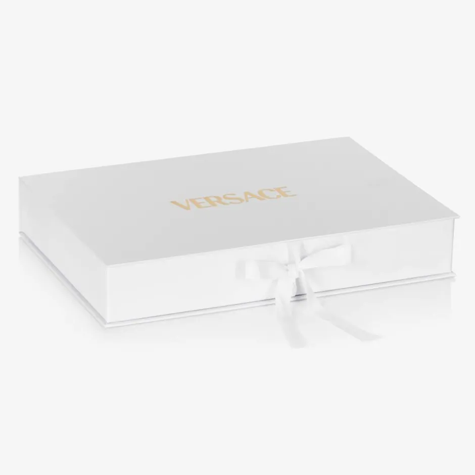 Light blue babygrow and hat set for boys by luxury Italian fashion house Versace, made in soft cotton jersey. For a distinctive look, both pieces are patterned in the designer's iconic Barocco print in white. The babygrow has a sweet Peter Pan collar, with gold-tone popper fastenings on the back and between the legs to help with dressing. Coming in a branded gift box, this lovely set makes an ideal present for a new arrival.