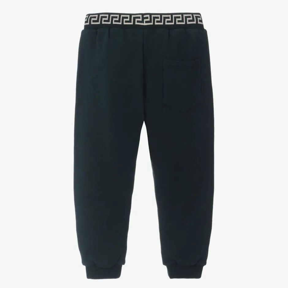 Casual and comfortable for boys, these navy blue cotton jersey joggers are by luxury brand Versace. Trimmed with beige stripes down the sides, they have the iconic Medusa logo embroidered on the front and Greca trim on the elasticated waistband. They are finished with a patch pocket on the back.