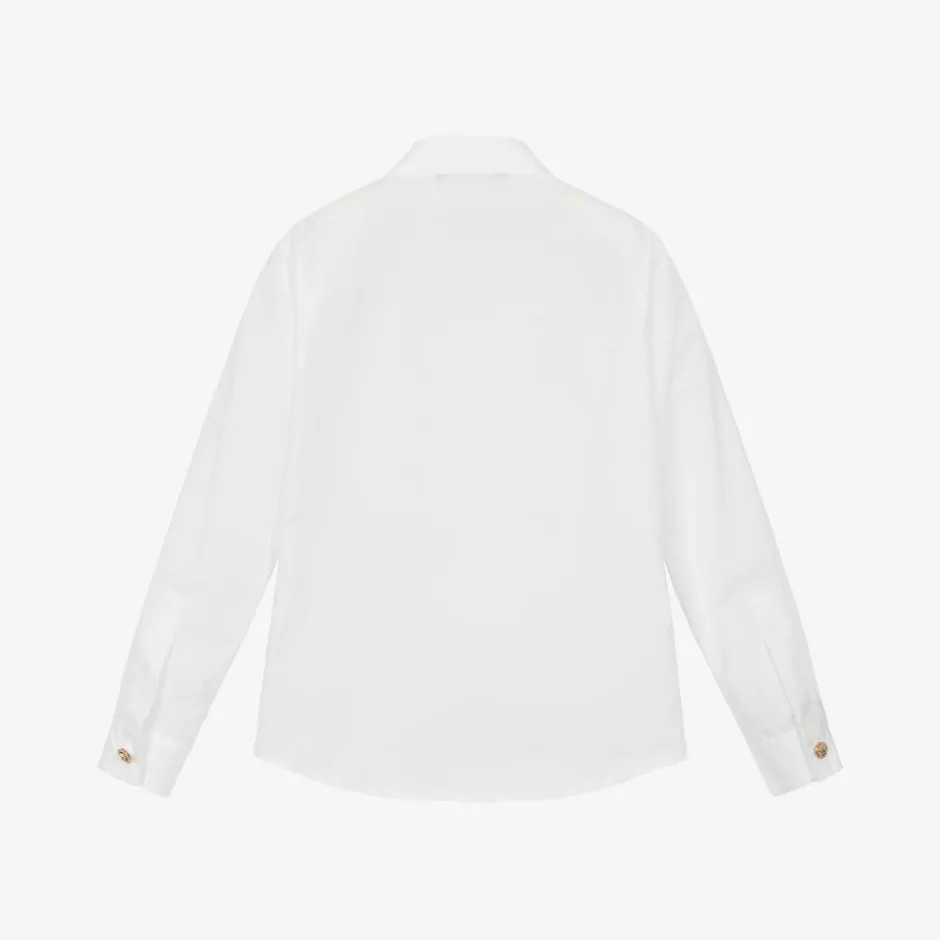 A smart white cotton shirt for boys by luxury Italian label Versace, featuring the brand's distinctive black logo patch on one cuff. Made from soft, lightweight poplin, this classic style is completed with gold-tone Medusa embossed buttons on the neckline and cuffs.