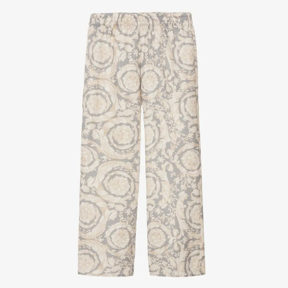 A pair of elegant, silk twill trousers for girls by luxury label Versace, patterned with the Italian designer's ornate Barocco print in soft hues of ivory and grey. Beautifully silky and lightweight, this timeless style has a stretchy elasticated waistband for a comfortable fit.