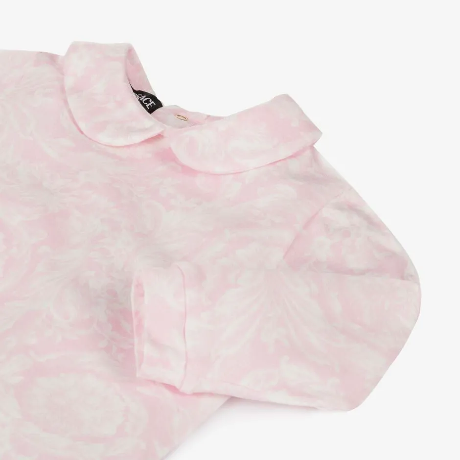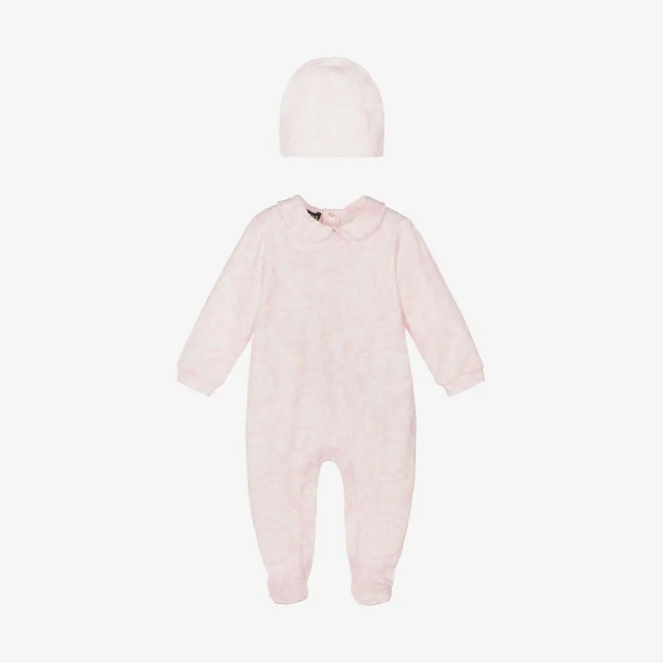 Light pink babygrow and hat set for girls by luxury Italian fashion house Versace, made in soft cotton jersey. For a distinctive look, both pieces are patterned in the designer's iconic Barocco print in white. The babygrow has a sweet Peter Pan collar, with gold-tone popper fastenings on the back and between the legs to help with dressing. Coming in a branded gift box, this lovely set makes an ideal present for a new arrival.