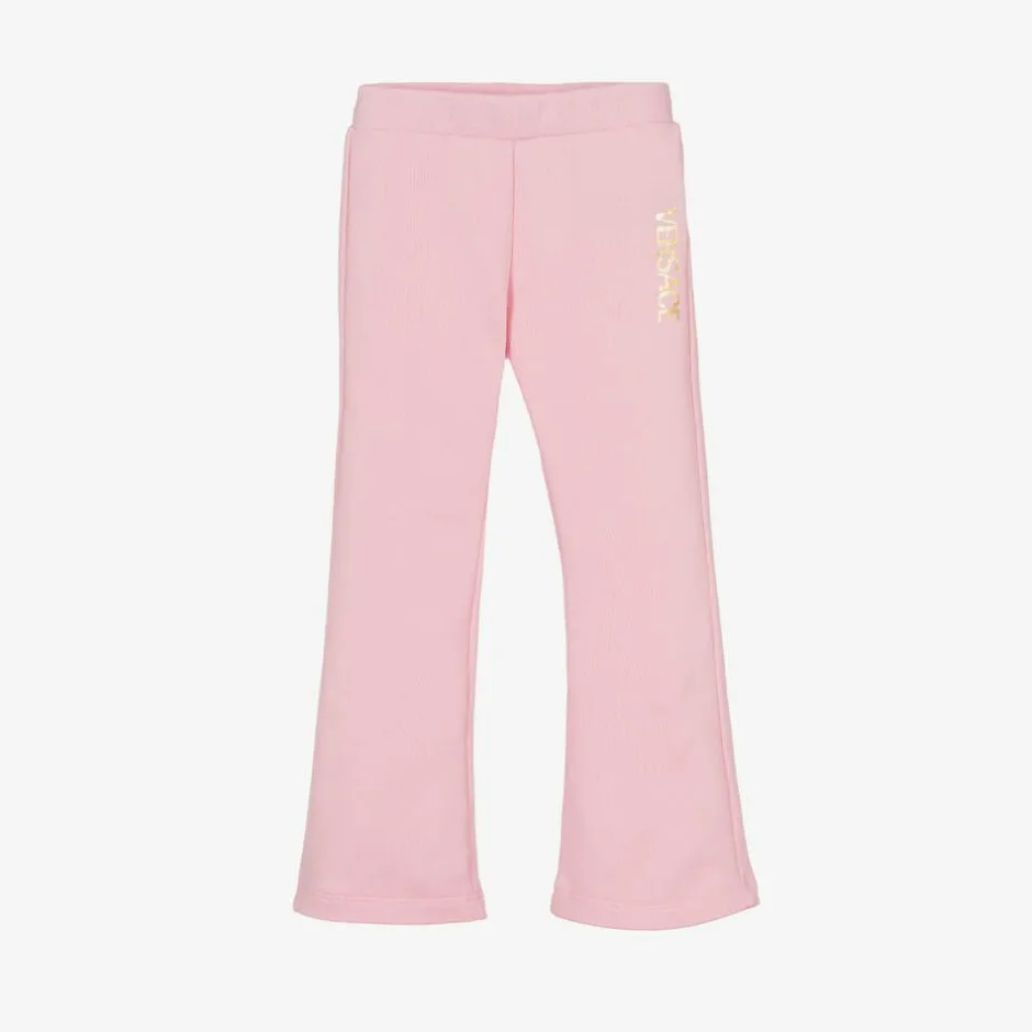 Soft and comfortable pink cotton joggers for little girls from luxury brand Versace. Made in mid-weight jersey with an elasticated waist, these flared joggers have a metallic gold logo on the leg for a touch of sparkle.