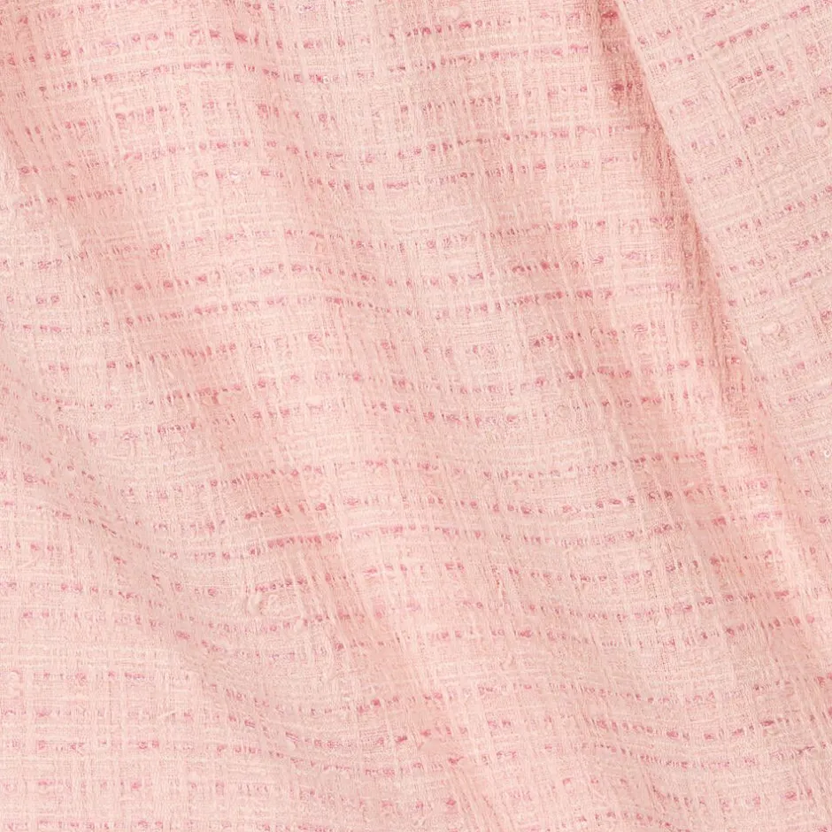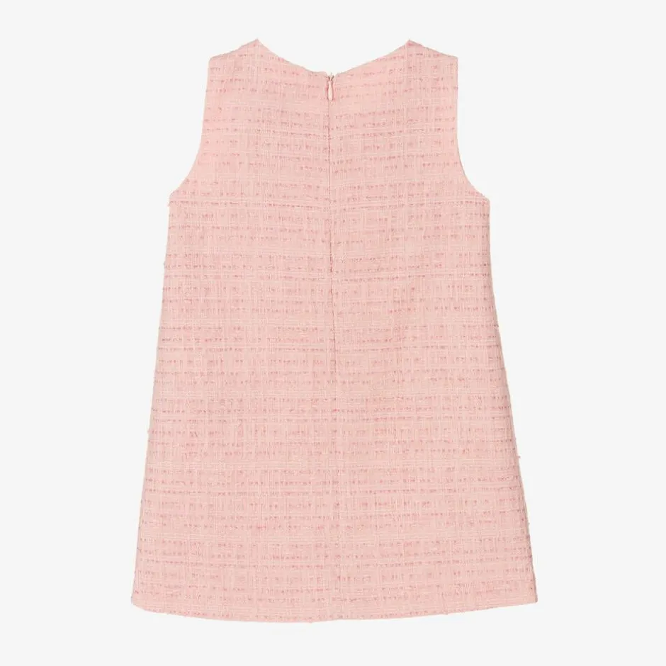 Smart pink tweed dress for girls by luxury Italian label Versace, woven with shiny thread and tiny sequins for a subtle touch of sparkle. Accented with distinctive gold-tone Medusa '95 hardware, this sleeveless design has elegant pleats on the front to create a stylish A-line silhouette. The dress is lined in silk-blend crêpe for comfort and fastens on the back with a neat, concealed zip.