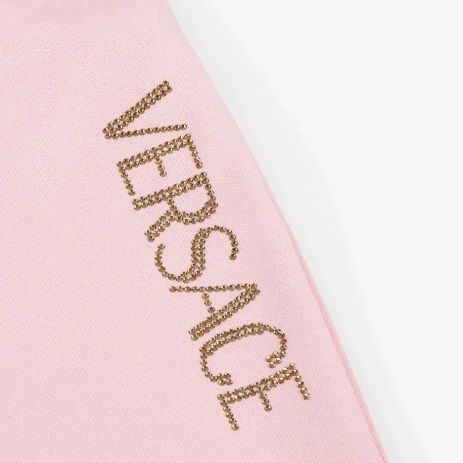 From Versace, a pair of pink cotton joggers for junior girls. Made in mid-weight jersey for comfort, these flared joggers have a diamanté logo on one leg for a sparkly designer finish.