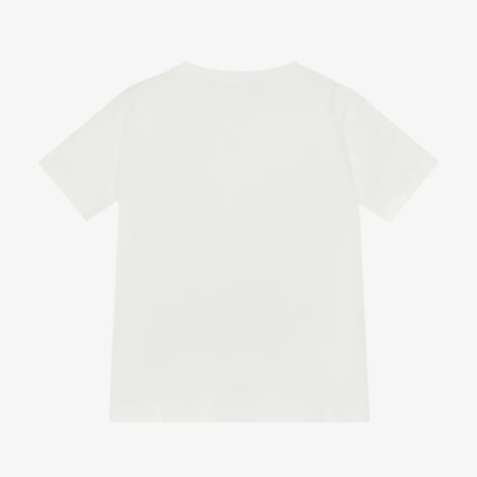 Off-white short-sleeved T-shirt for baby boys and girls by Italian luxury designer Versace. For a distinctive look, the front is printed with a Greca framed Medusa logo in metallic silver. Made in soft cotton jersey, this casual tee has a crew neckline and silver-tone poppers on one shoulder to assist with dressing.