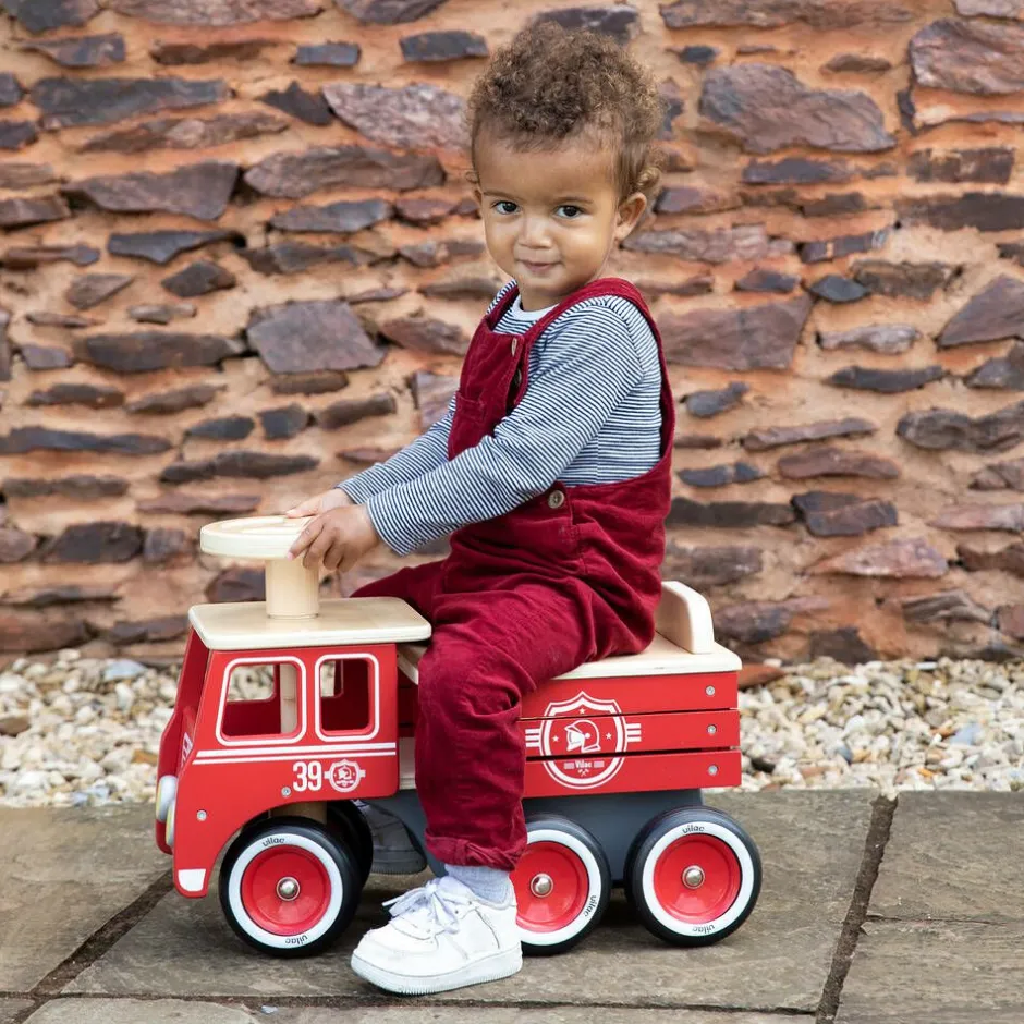 Wooden red ride-along fire engine for little boys and girls, by Vilac. Painted with fun badges and numbers, encourage your budding firefighter to develop their coordination by turning the interactive steering wheel. It has plastic wheels for a smooth ride and a comfortable wooden seat. Underneath the seat there is a small storage area for any toys or firefighter play equipment.