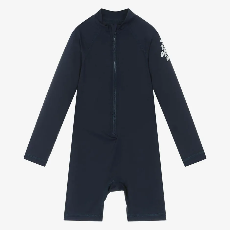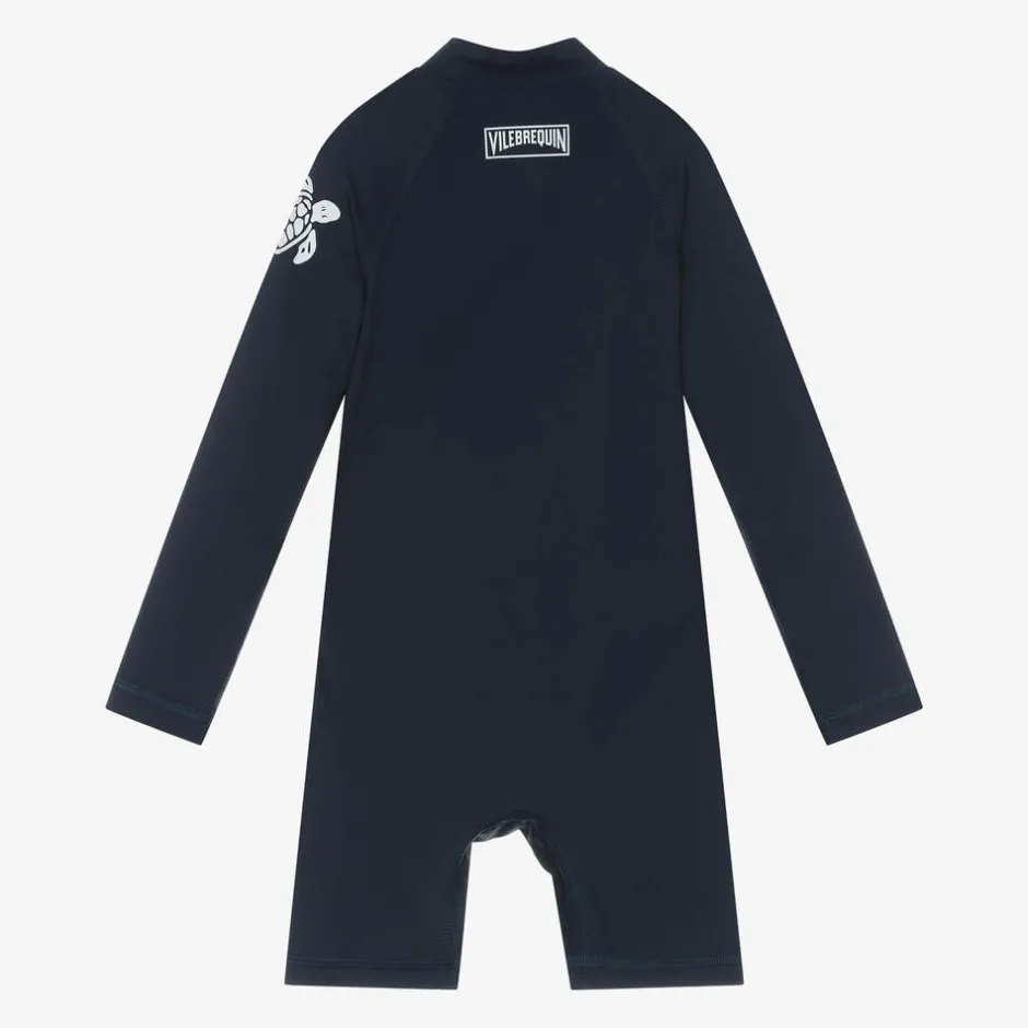 Silky soft and stretchy, a navy blue long-sleeved sun suit for boys and girls by Vilebrequin. Made from recycled fibres, the fabric has UPF50+. The designer's signature logo is printed on the back, and their iconic turtle motif is on one sleeve. The front zip fastening has a protective chin guard for added comfort.