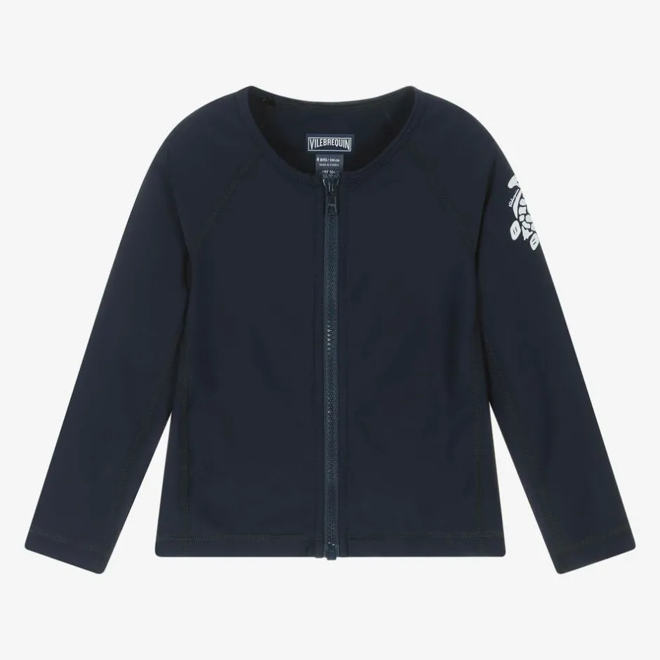 Navy blue, zip-up swim top for boys and girls by Vilebrequin. Silky soft and stretchy, this sun protective top is made from recycled Econyl fabric with UPF50+. The designer's signature logo is printed on the back, and their iconic turtle motif is on one sleeve.