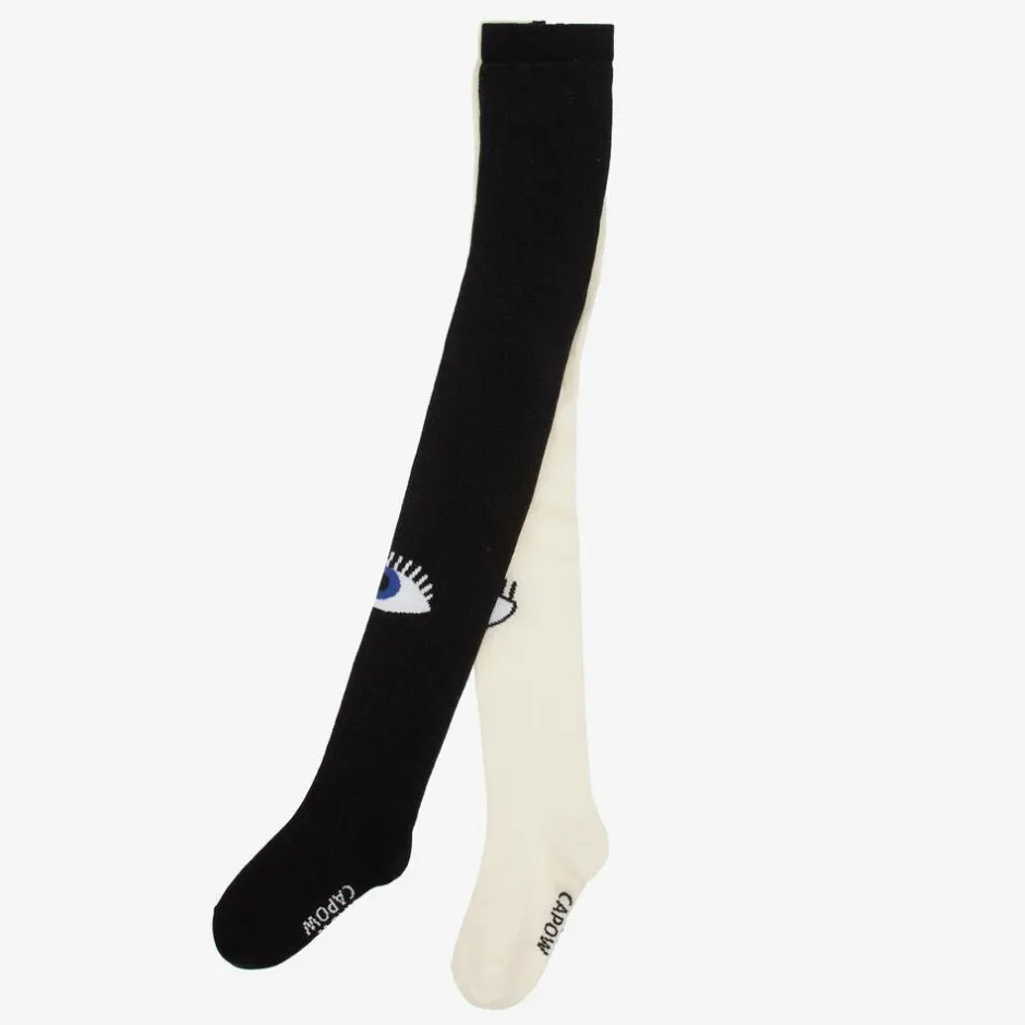 Black and white tights for girls by Wauw Capow, in a cool and quirky design. Made in a soft and stretchy organic cotton blend, they have a quirky eye design on each of the knees for a playful, striking look.