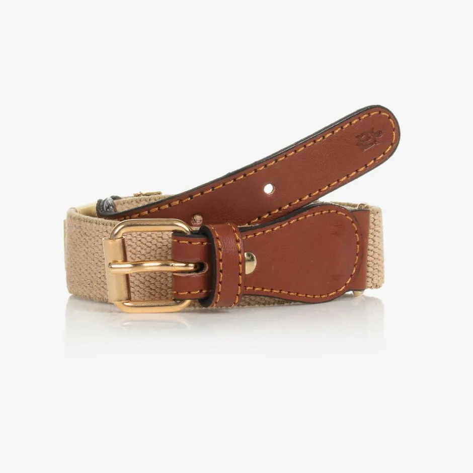A smart Italian-crafted belt for boys and girls by Zaccone, in beige. Handmade in soft cotton canvas, it has brown leather trims, with a cute mouse silhouette design. With an adjustable metal clip, it fastens with a golden buckle for that classic look.