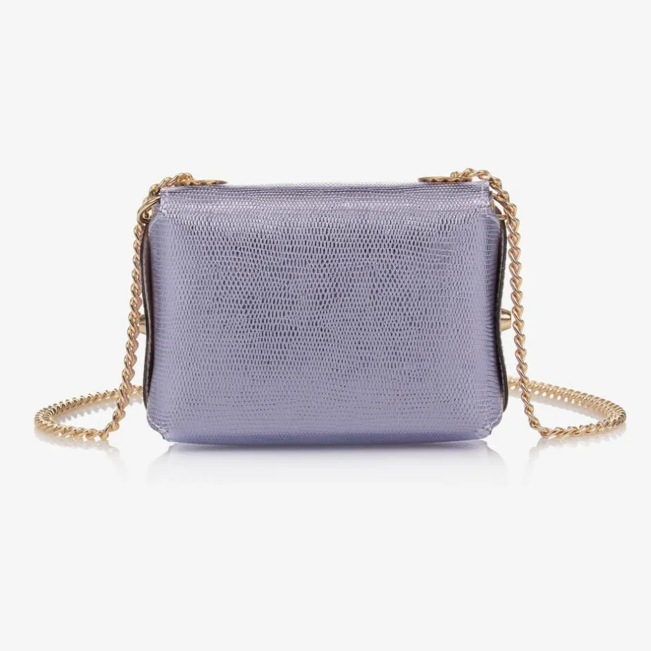 Beautiful metallic purple bag for girls by Italian brand Zaccone, in grained faux leather. Lovely for accessorising a special occasion outfit, it has a leather-lined main compartment with a gold twist clasp fastening on the front. The bag is worn using the gold chain shoulder strap, with sparkly diamanté's decorating the eyelets.