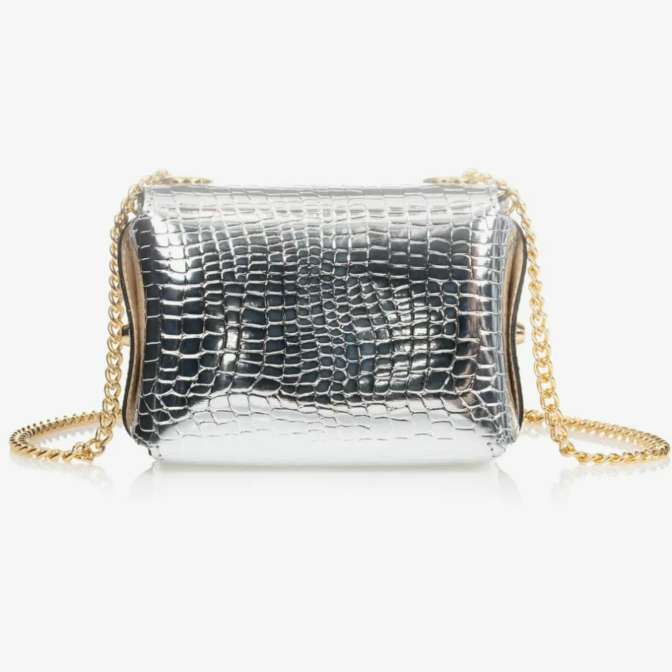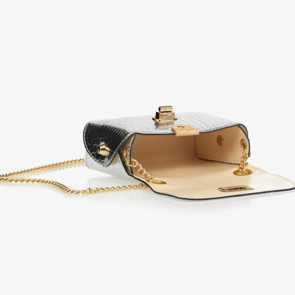 Shiny silver crocodile-effect mini shoulder bag for girls by Zaccone, made with soft leather and faux leather. It has one compartment with a smooth lining, a golden metal chain strap and a twist lock fastening.
