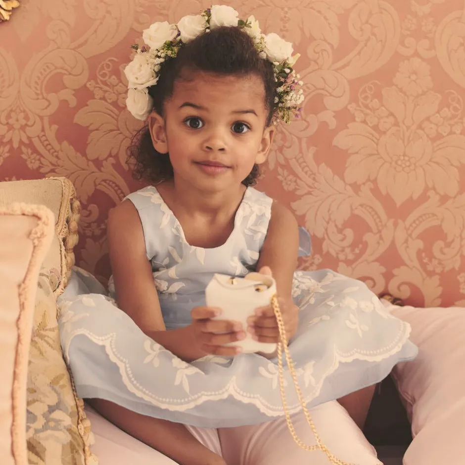 A white mini shoulder bag for girls by Italian brand Zaccone, combining real patent leather and faux leather. Cute and stylish, it has a bow with gold hardware decorated on the front flap and a gold chain shoulder strap. The main compartment has a smooth lining and fastens securely with a popper.