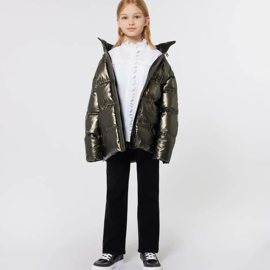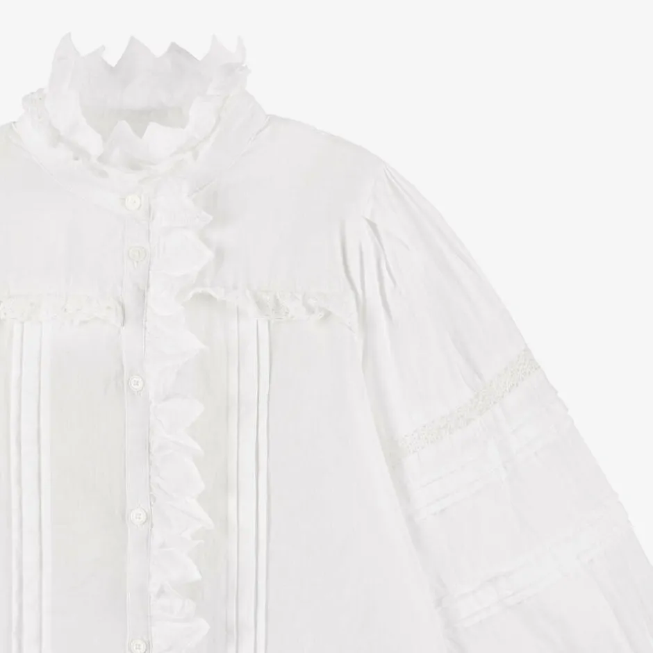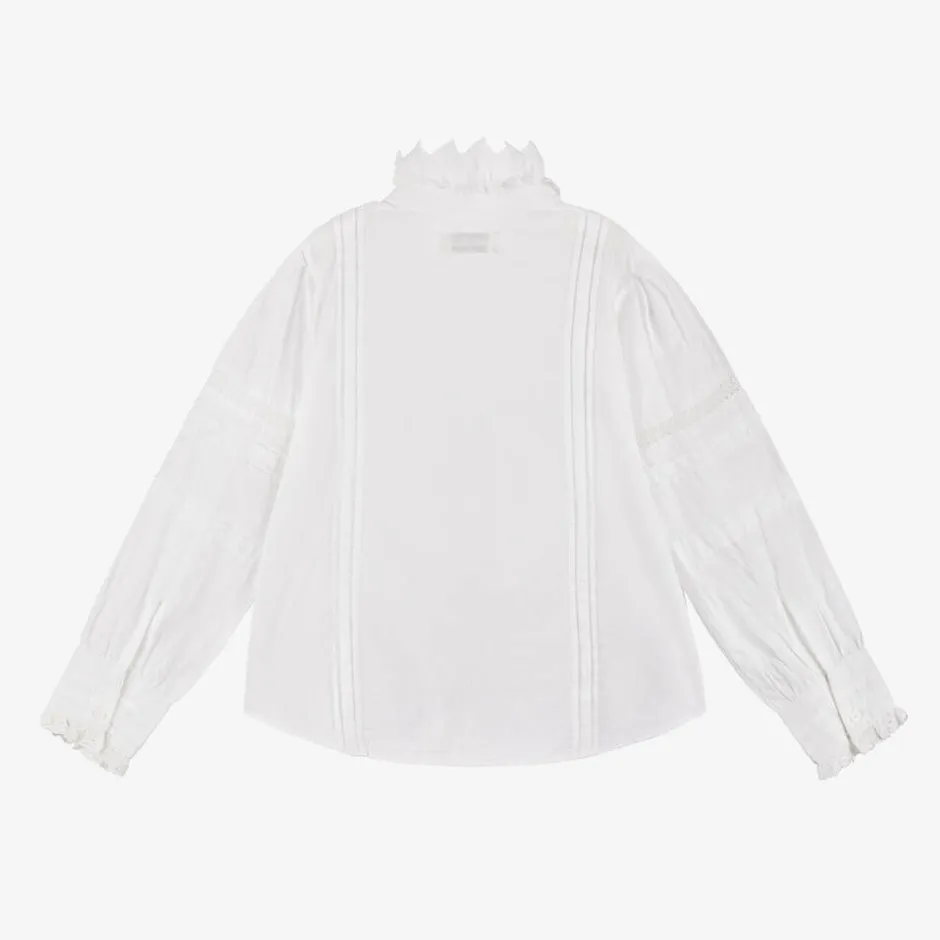 Beautiful white cotton blouse for girls by French designer Zadig&Voltaire, taking inspiration from the adult collection. Lightweight and semi-sheer, the stylish high-neck design features delicate crochet lace, zigzag edged ruffles and neat pintuck detailing. It buttons up on the front and cuffs.