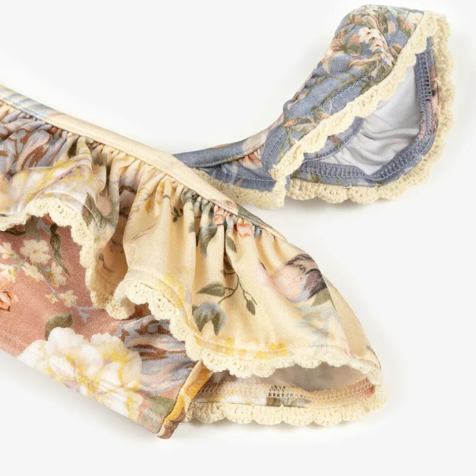 A gorgeous floral bikini for girls by luxury brand Zimmermann, designed in contrasting blue, pink and beige shades. This stylish resort wear two-piece is lined for comfort and trimmed with beautiful crochet-trimmed ruffles.