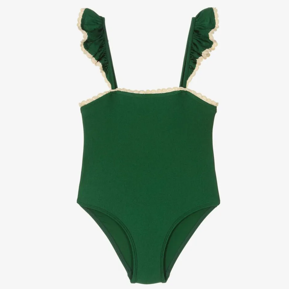This gorgeous emerald green swimsuit for girls by luxury designer Zimmermann, is ideal for stylish resort wear. Silky and stretchy and lined for comfort, it has ivory crochet trims and pretty ruffle shoulder straps.